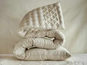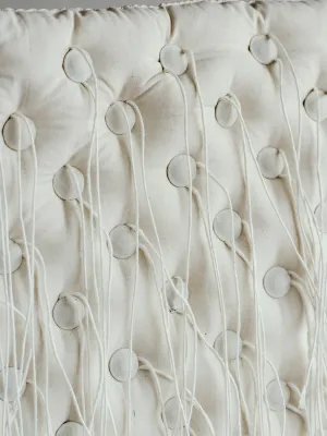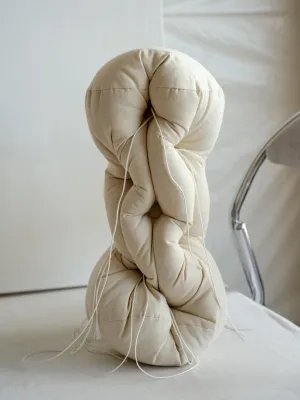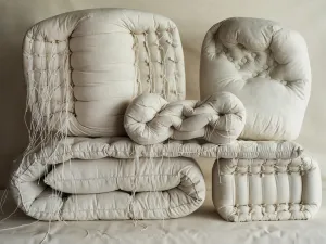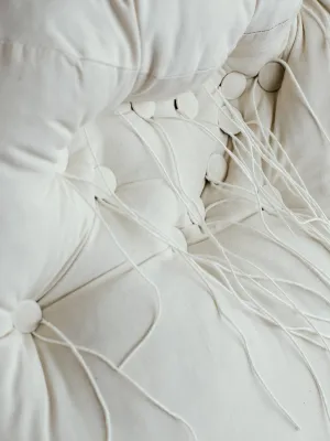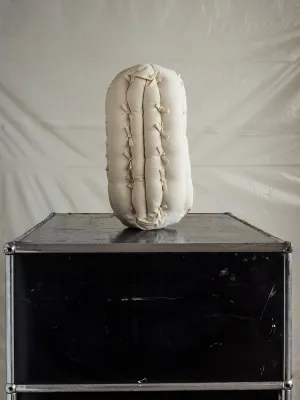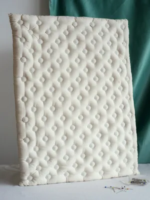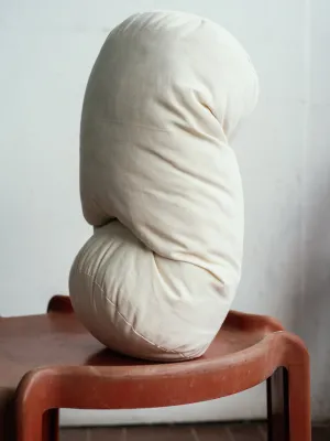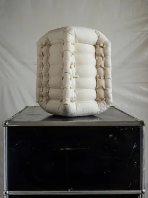 Far from the original use and shape of the mattress, this series of forms explores the technique's ability to create volume: an envelope of cotton fabric is filled with local wool flakes before being compressed with threads and buttons.